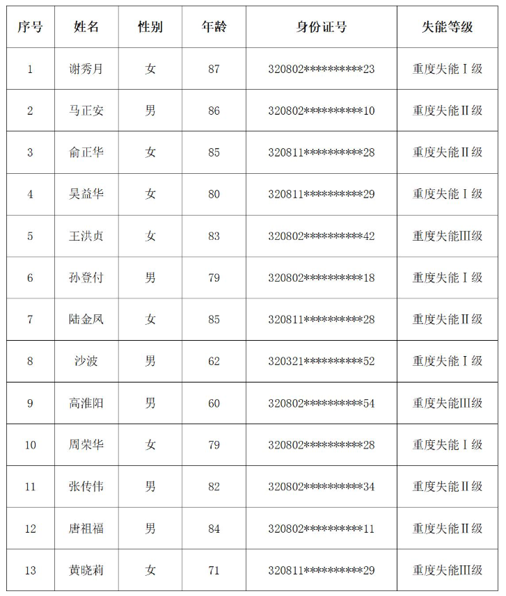 根据《市政府关于印发淮安市长期护理保险实施方案的通知》 (淮政发[2023] 2号) 、《关于印发<淮安市长期护理保险实施细则(试行)>的通知》 (淮政发[2023] 33号)、 《国家医保局办公室 民政部办公厅关于印发<长期护理失能等级评估标准(试行)的通知>(医保办发[2021]37号)》文件精神,经评估机构评估,现将市本级长期护理保险失能等级评估的结论公示如下: