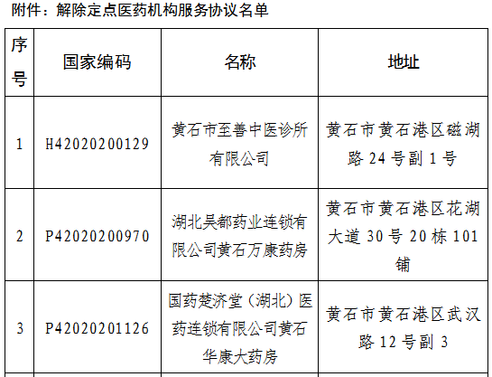 【黄石】关于解除黄石市至善中医诊所有限公司等5家定点医药机构服务协议的公示