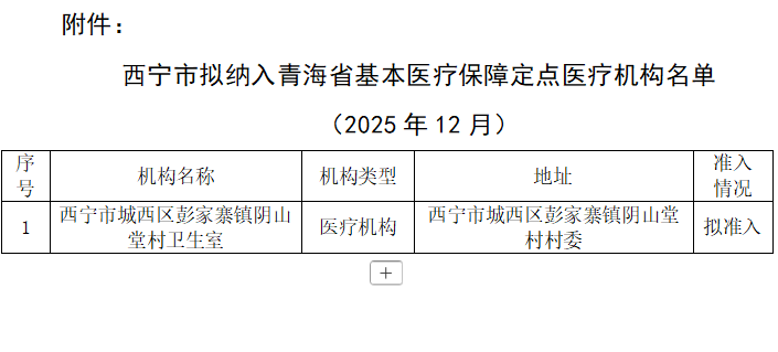 根据医疗保障定点医疗机构纳入相关规定,按照属地化管理原则,西宁市医疗保障经办服务中心对2025年12月提交申请的西宁市城西区彭家寨镇阴山堂村卫生室进行了准入评价,根据考评结果,拟将西宁市城西区彭家寨镇阴山堂村卫生室纳入青海省基本医疗保障定点医药机构范围,现予以公示,公示期为2025年12月16日至2025年12月22日(共7天),公示期间如有异议,请实名反映至西宁市医疗保障局。