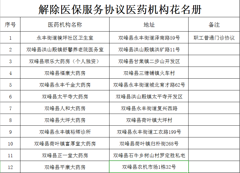根据《医疗机构医疗保障定点管理暂行办法》第十条、第四十一条和《零售药店医疗保障定点管理暂行办法》第九条、第三十八条、第四十条第15款之规定。经研究,决定解除以下机构医疗保障定点服务协议。现将机构信息公示。