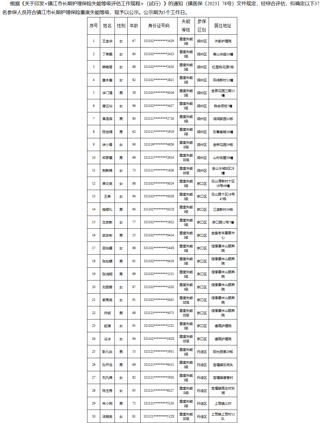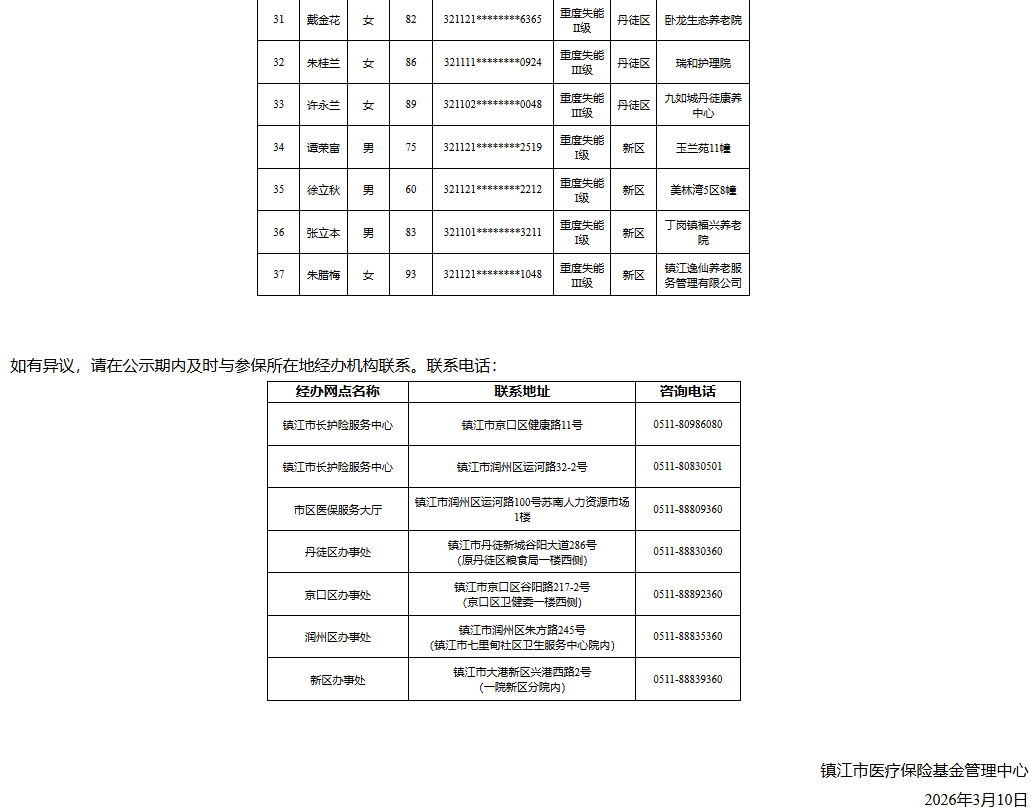 【镇江】2026年度镇江市长期护理保险失能等级评估结论公示(3月第二批)