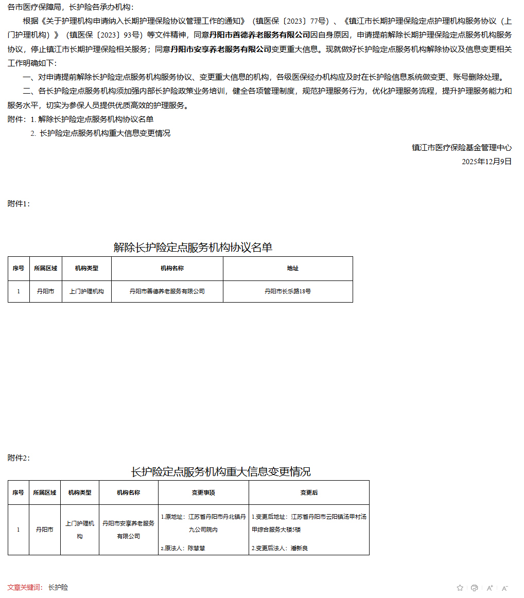 【镇江】关于镇江市长期护理保险定点服务机构解除协议及信息变更的公告