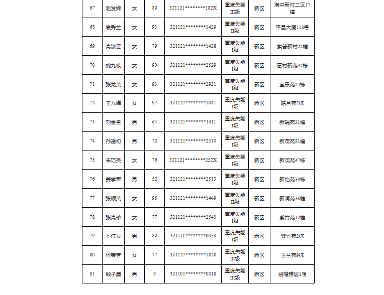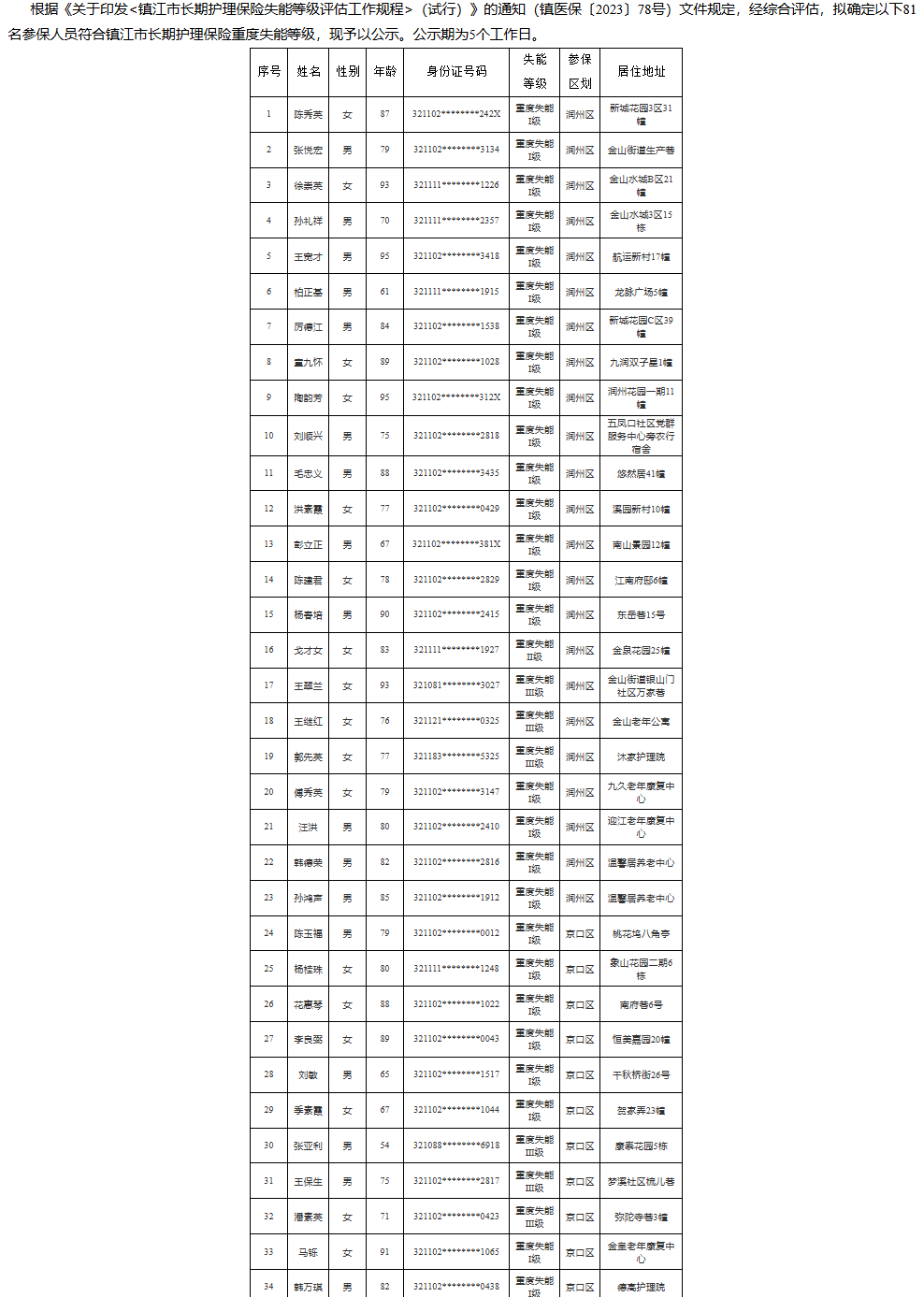 【镇江】2025年度镇江市长期护理保险失能等级评估结论公示(12月第二批)
