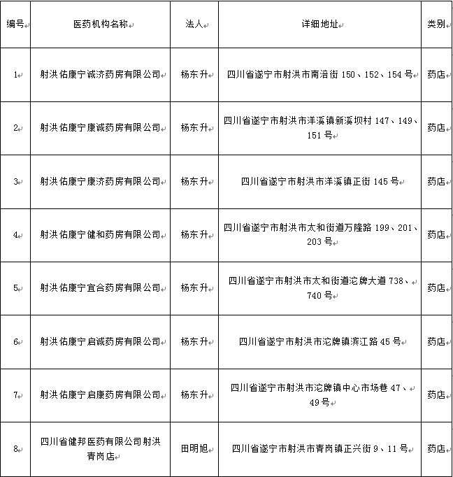 根据《医疗机构医疗保障定点管理暂行办法》(国家医疗保障局令第2号)、《零售药店医疗保障定点管理暂行办法》(国家医疗保障局令第3号)和《四川省医保局关于印发〈四川省医药机构医疗保障定点评估细则〉的通知》(川医保规〔2024〕2号),经医药机构自愿申请、现场评估、集体决策、遂宁抽查复审,拟将射洪佑康宁诚济药房有限公司等8家药店纳入医保定点协议管理。