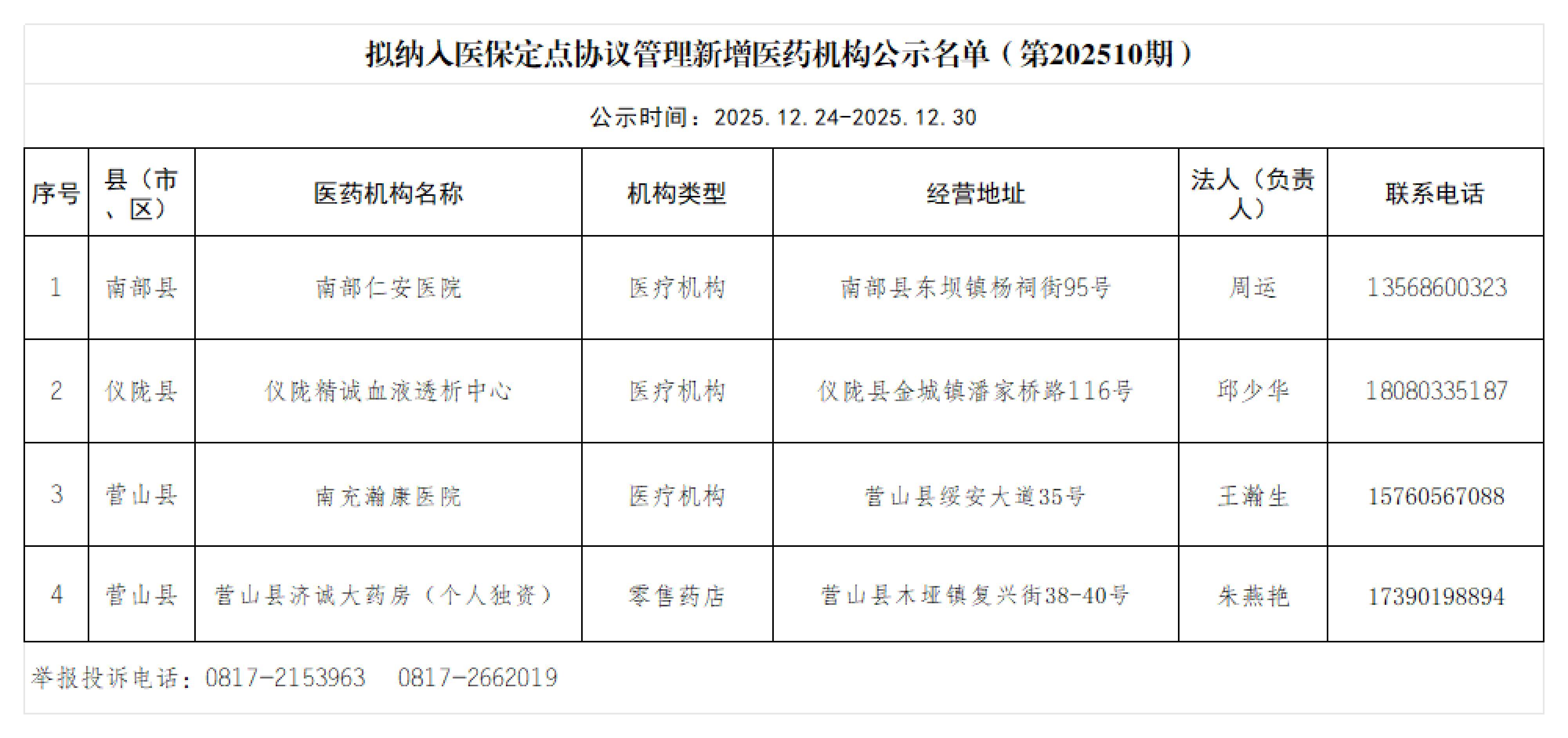 【南充】拟纳入医保定点协议管理新增医药机构公示名单(第202510期)