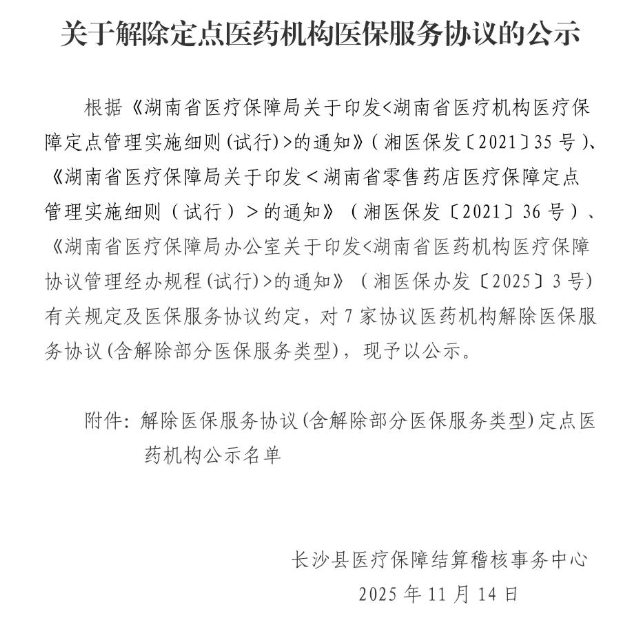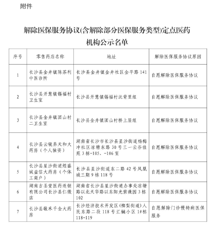 【长沙】关于解除定点医药机构医保服务协议的公示