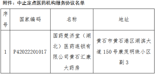 【黄石】关于中止国药楚济堂(湖北)医药连锁有限公司黄石汇康大药房定点医药机构服务协议的公示