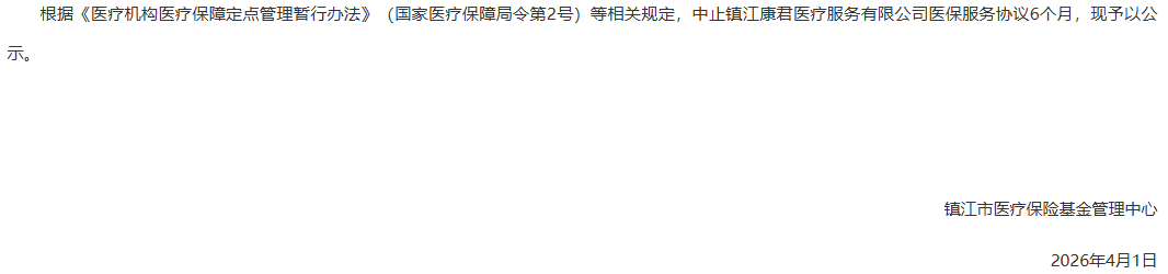 【镇江】关于中止医保服务协议的公示