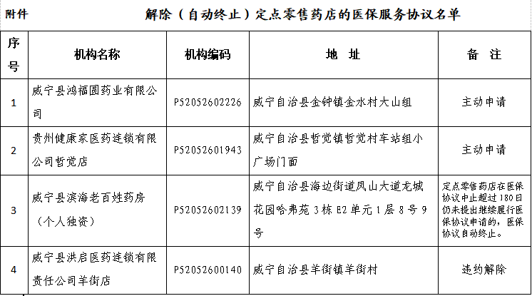 【毕节】威宁自治县医疗保障局关于解除(自动终止)定点零售药店医保服务协议的公告