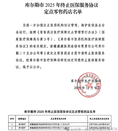 【新疆】库尔勒市2025年终止医保服务协议定点零售药店名单