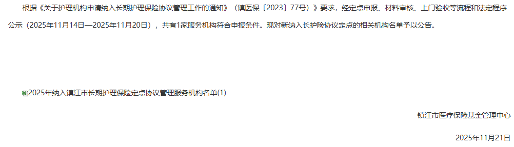 【镇江】2025年镇江市纳入长期护理保险定点服务机构协议管理机构名单公告