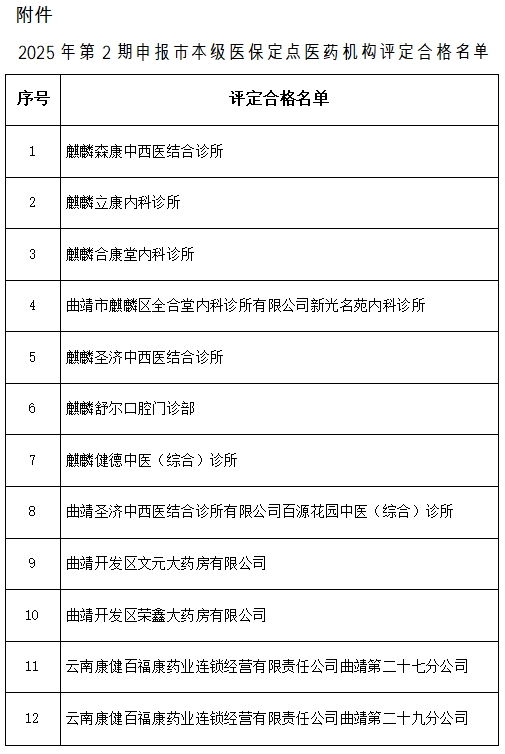 【曲靖】曲靖市医疗保险中心关于2025年第2期申报市本级医保定点医药机构评定合格名单的公示