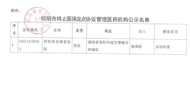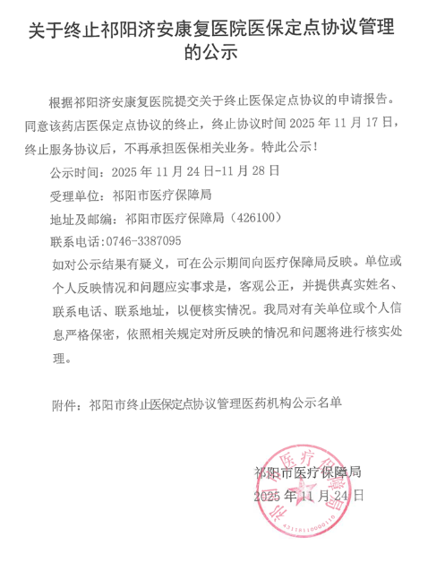 【永州】关于终止祁阳济安康复医院医保定点协议管理的公示