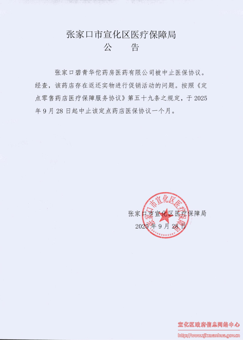 【张家口】宣化区医疗保障局关于中止医保协议的公告