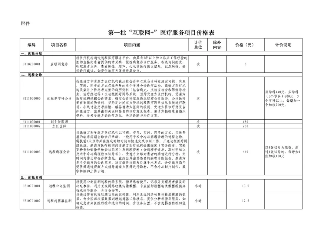 为推动“互联网+医疗健康”发展,根据《国务院办公厅关于促进“互联网+医疗健康”发展的意见》(国办发﹝2018﹞26号)、《山东省人民政府办公厅关于印发山东省推进“互联网+医疗健康”示范省建设行动计划(2019-2020年)的通知》(鲁政办发〔2019〕19号)和《国家医疗保障局关于完善“互联网+”医疗服务价格和医保支付政策的指导意见》(医保发﹝2019﹞47号)精神,现就“互联网+”医疗服务价格和医保支付政策提出以下实施意见:一、总体要求以习近平新时代中国特色社会主义思想为指导,坚持以人民健康为中心,按照分类管理、公平公正、鼓励创新的原则,将“互联网+”医疗服务价格纳入现行医疗服务价格和医保支付政策体系统一管理,实行公平的线上、线下医疗服务价格和医保支付政策,建立开放灵活、多方参与的“互联网+”医疗服务价格形成机制,合理确定并动态调整价格、医保支付政策,使“互联网+”在促进医疗服务降本增效、改善患者就医体验、重构医疗市场竞争关系等方面发挥积极作用。二、“互联网+”医疗服务价格项目管理(一)项目分类管理。非营利性医疗机构依法合规开展的“互联网+”医疗服务按项目管理,未经批准的医疗服务价格项目不得向患者收费。营利性医疗机构依法合规开展的“互联网+”医疗服务,可自行设立医疗服务价格项目。互联网医院按其登记注册的所有制形式和经营性质适用相应的价格项目政策。(二)项目设立权限。“互联网+”医疗服务价格项目,由省医疗保障局设立。医疗机构已有线下项目通过线上开展、延伸并申请立项收费的,由各市医疗保障局受理,符合条件的,提交省医疗保障局集中审核确定。驻济省(部)属公立医疗机构申请立项收费的,直接报省医疗保障局。设立医疗服务价格项目,应严格执行国家统一的立项原则、项目名称、服务内涵、计价单元、计价说明、编码规则等。(三)项目设立条件。设立“互联网+”医疗服务价格项目,应同时具备以下基本条件:属于卫生行业主管部门准许开展“互联网+”方式、临床路径清晰、技术规范明确的服务;面向患者提供直接服务;服务过程以互联网等媒介远程完成;服务能够实现线下相同项目的功能;服务应对诊断、治疗疾病具有实质性效果。不得以变换表述方式、拆分服务内涵、增加非医疗步骤等方式或名义增设项目。(四)不纳入的项目。仅发生于医疗机构与医疗机构之间、医疗机构与其他机构之间,不直接面向患者的服务;医疗机构向患者提供不属于诊疗活动的服务;非医务人员提供的服务,不作为医疗服务价格项目。以上包括但不限于远程手术指导、远程查房、医学咨询、教育培训、科研随访、数据处理、医学鉴定、健康咨询、健康管理、便民服务等。三、“互联网+”医疗服务价格管理(一)“互联网+”医疗服务价格实行省级管理。公立医疗机构提供“互联网+”医疗服务价格,主要实行政府调节。省医疗保障局制定调整全省公立医疗机构提供的“互联网+”医疗服务项目价格上限(见附件)。附件所列价格为三级公立医疗机构的最高价格,其他公立医疗机构的最高价格在此基础上降低10%-30%。公立医疗机构按不超过省医疗保障局公布的最高价格收取费用。公立医疗机构满足个性化、高层次需求为主的“互联网+”医疗服务,以及向国(境)外提供的“互联网+”医疗服务,要落实特需医疗规模控制的要求,实行市场调节价。价格由公立医疗机构综合考虑服务成本、患者需求等因素,自主确定并书面告知所在市医疗保障局。驻济省(部)属公立医疗机构书面告知省医疗保障局。非公立医疗机构提供“互联网+”医疗服务,实行市场调节价。(二)新开展项目价格管理。公立医疗机构新开展项目的价格,应向所在市医疗保障部门提交价格建议、成本测算结果、经济性评估报告、与线下同类项目的比较分析等资料,由市医疗保障部门汇总报省医疗保障局。驻济省(部)属公立医疗机构直接报省医疗保障局。省医疗保障局制定或与医疗机构协议确定试行价格,试行期不超过2年。试行期满,由省医疗保障局在评估服务效果和成本收入等情况的基础上公布正式价格。四、医保支付政策(一)支付范围。定点医疗机构提供的“互联网+”医疗服务,由省医疗保障局确定是否纳入医保支付范围。纳入医保支付范围的,由各统筹地区按照不高于省确定的公立医疗机构价格上限确定医保支付标准。“互联网+”医疗服务与医保支付范围内的线下内容相同,且执行相应公立医疗机构价格的,经相应程序后,纳入医保支付范围并按现行规定支付。属于全新内容的“互联网+”并执行政府调节价格的基本医疗服务,省医疗保障局综合考虑临床价值、价格水平、医保支付能力等因素,确定是否纳入医保支付范围。(二)协议管理。各级医疗保障部门要根据“互联网+”医疗服务的特点,合理确定总额控制指标,完善定点医疗机构服务协议,调整医保信息系统,优化结算流程,同时加强医疗服务监管,支持定点医疗机构依托“互联网+”提供规范、便捷、优质、高效的医疗服务。要健全协议管理退出机制,对违反协议的,要充分运用约谈、限期整改、暂停结算、拒付费用、暂停协议、解除协议等措施,严肃追究违约责任。(三)基金监管。各级医疗保障部门要加强基金监管力度,将智能监控系统联网上线纳入医药服务