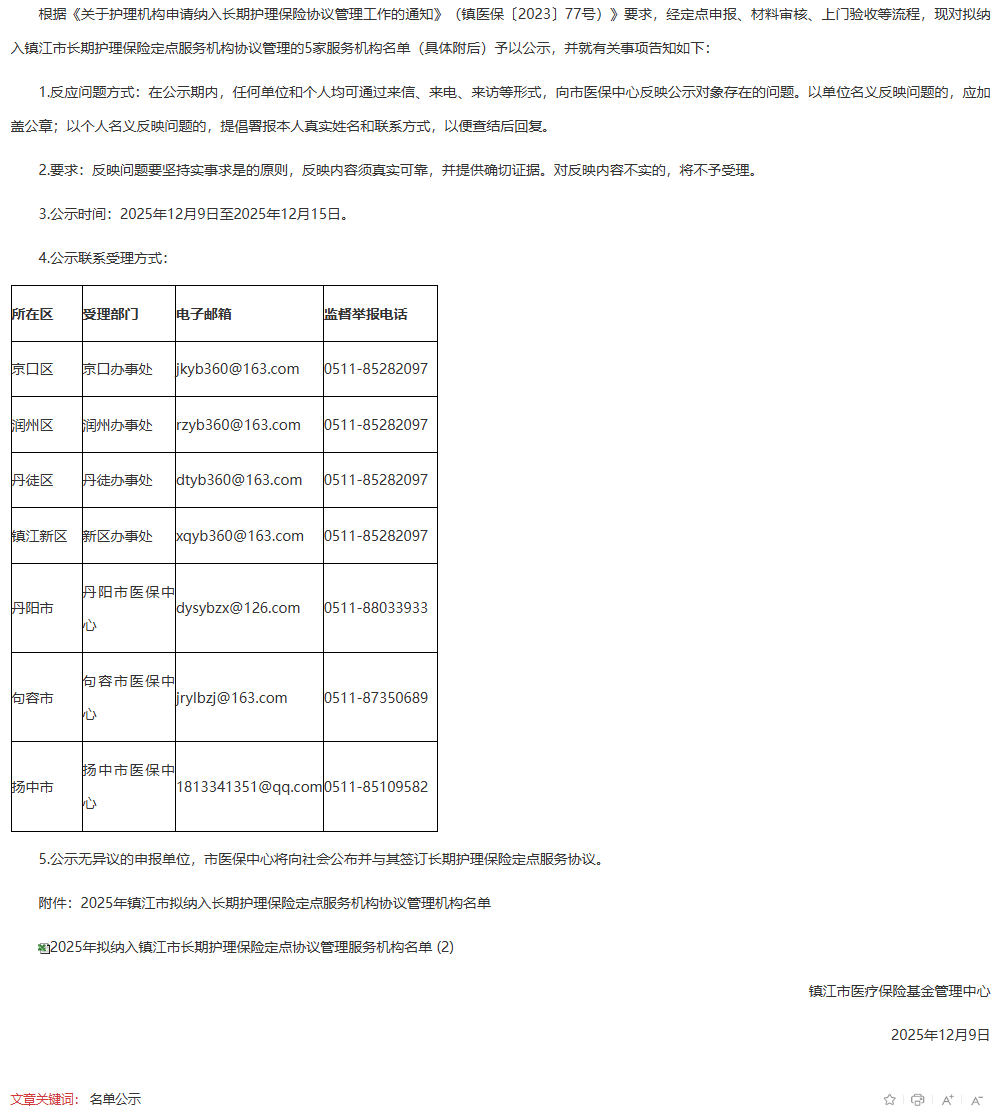【镇江】2025年镇江市拟纳入长期护理保险定点服务机构协议管理机构名单公示