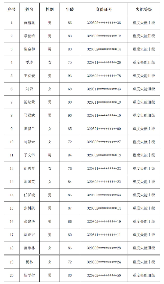 根据《市政府关于印发淮安市长期护理保险实施方案的通知》 (淮政发[2023] 2号) 、《关于印发<淮安市长期护理保险实施细则(试行)>的通知》 (淮政发[2023] 33号)、 《国家医保局办公室 民政部办公厅关于印发<长期护理失能等级评估标准(试行)的通知>(医保办发[2021]37号)》文件精神,经评估机构评估,现将市本级长期护理保险失能等级评估的结论公示如下: