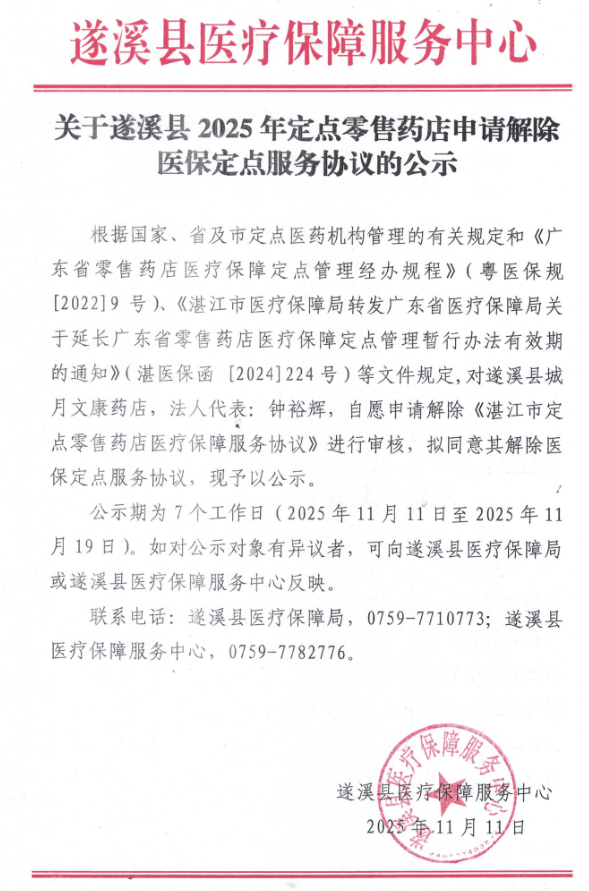【湛江】关于遂溪县2025年定点零售药店申请解除医保定点服务协议的公示