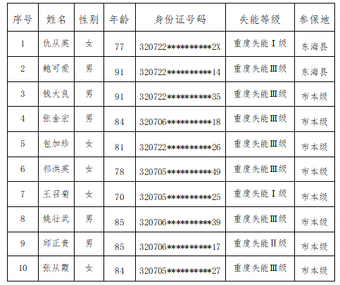 根据《市政府关于建立长期护理保险制度的意见》(连政发〔2023〕26号)、《连云港市职工长期护理保险实施细则(试行)》(连医保〔2023〕44号)文件精神,按照国家医保局《长期护理失能等级评估标准(试行)》(医保办发〔2021〕37号),经评估机构评估,现将本次连云港市长期护理保险失能等级评估的结论公示如下: