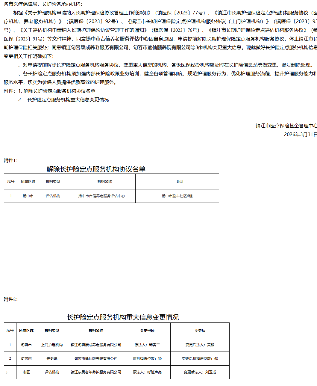 【镇江】关于镇江市长期护理保险定点服务机构解除协议及信息变更的通告