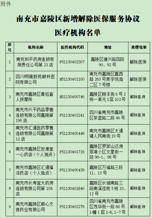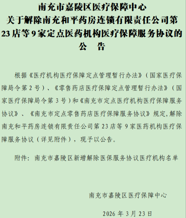 【南充】关于解除南充和平药房连锁有限责任公司第23店等9家定点医药机构医疗保障服务协议的公告