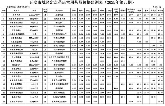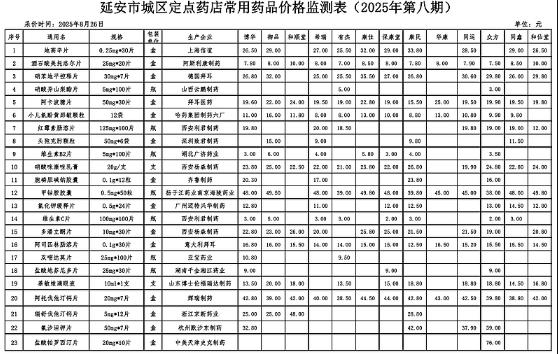 【延安】延安市城区部分定点药店常用药品零售价格监测情况(2025年第八期)