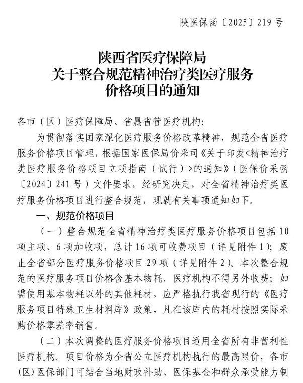 【陕西】陕西省医疗保障局关于整合规范精神治疗类医疗服务价格项目的通知