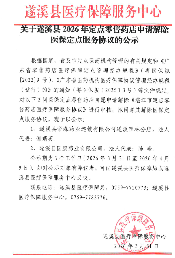 【湛江】关于遂溪县2026年定点零售药店申请解除医保定点服务协议的公示
