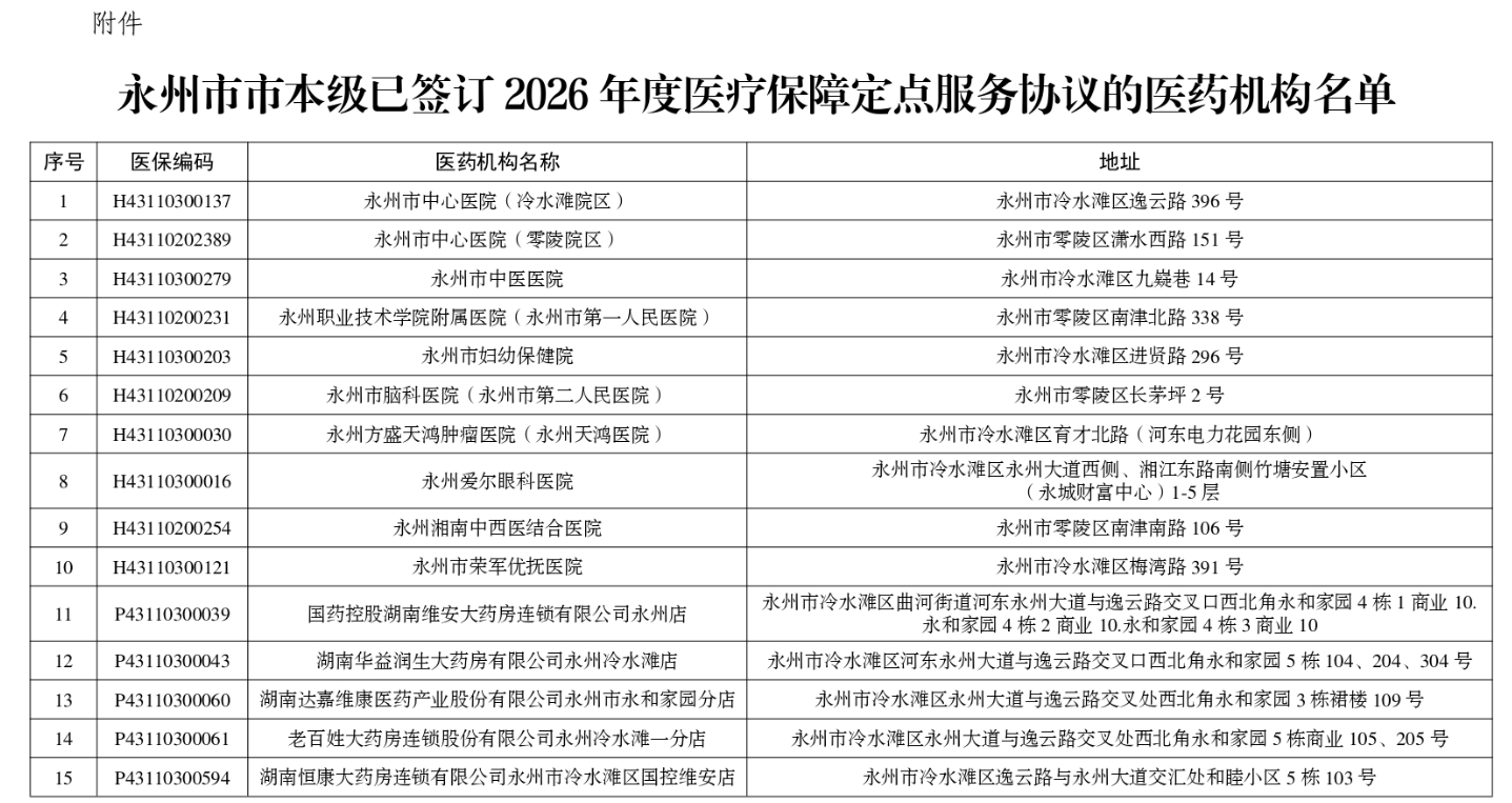 根据《关于印发<湖南省定点医疗机构医疗保障服务协议范本(2026版)>和<湖南省定点零售药店医疗保障服务协议范本(2026版)>的通知》的规定,现将永州市市本级已签订2026年度医疗保障定点服务协议的医药机构名单向社会予以公布。