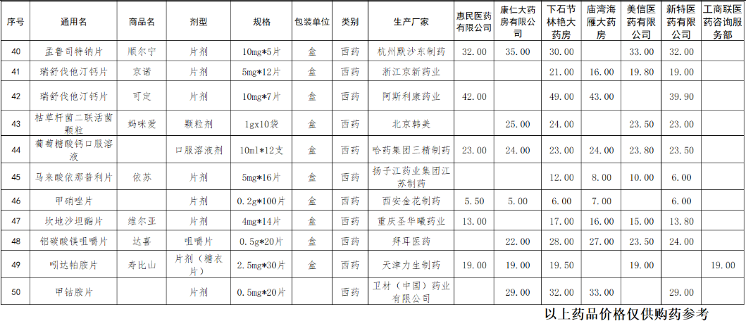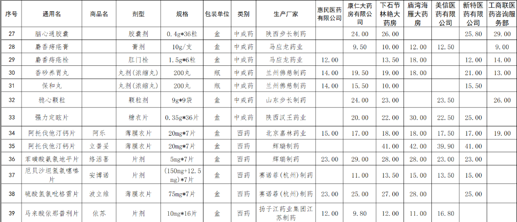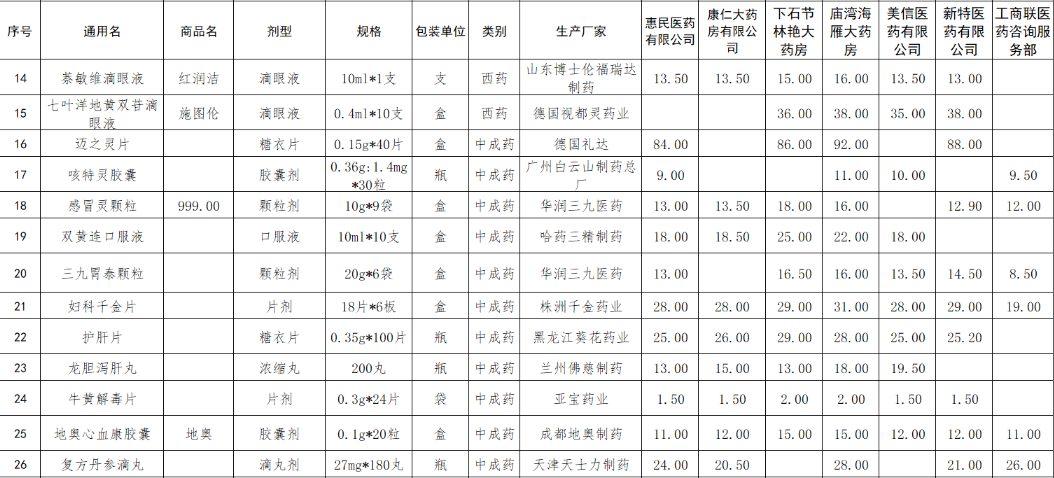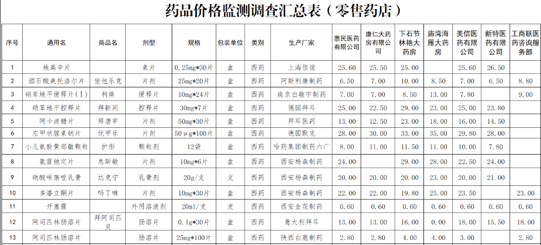 【铜川】9月份铜川市耀州区部分药店常用药品价格监测表