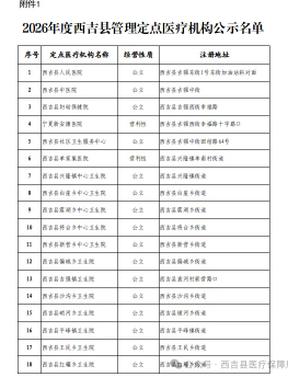 根据《医疗机构定点管理暂行办法》(国家医保局第2号令)、《零售药店定点管理暂行办法》(国家医保局第3号令)、《医疗保障基金使用监督管理条例》及《宁夏回族自治区基本医疗保险定点医药机构医疗服务协议文本》(2024版)规定。为进一步加强管理、监督和举报,现将2026年西吉县管理定点医药机构名单予以公示,诚请社会各界监督。