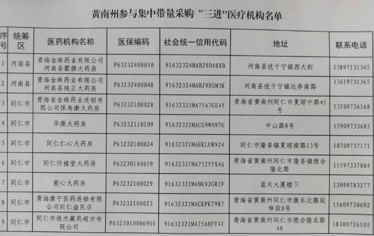 为深入贯彻落实国家、省际联盟和省级药品集中带量采购工作常态化、制度化,进一步扩大集采药品覆盖面,让群众就近买到质优价宜的集中带量采购中选药品,让集采改革成果惠及更广大人民群众。根据省医疗保障局相关要求,为持续推进集中带量采购药品进基层医疗机构、进民营医疗机构、进零售药店(简称“三进”),按照“自愿申请、主动承诺”的原则,确定我州9家定点医药机构纳入“三进”范围,现予以公示(详见附件)。公示期间,如对公示内容有异议,请以书面形式向黄南州医疗保障局反馈,反馈材料需注明联系人及联系方式。