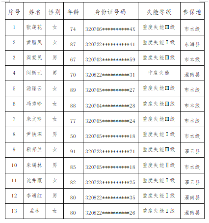 根据《市政府关于建立长期护理保险制度的意见》(连政发〔2023〕26号)、《连云港市职工长期护理保险实施细则(试行)》(连医保〔2023〕44号)文件精神,按照国家医保局《长期护理失能等级评估标准(试行)》(医保办发〔2021〕37号),经评估机构评估,现将本次连云港市长期护理保险失能等级评估的结论公示如下: