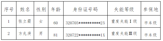 根据《市政府关于建立长期护理保险制度的意见》(连政发〔2023〕26号)、《连云港市职工长期护理保险实施细则(试行)》(连医保〔2023〕44号)文件精神,按照国家医保局《长期护理失能等级评估标准(试行)》(医保办发〔2021〕37号),经评估机构评估,现将本次连云港市长期护理保险失能等级评估的结论公示如下: