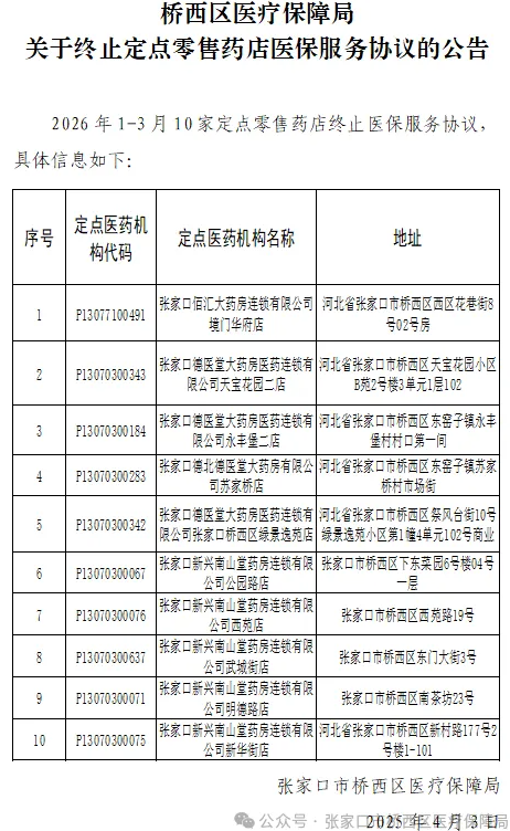 【张家口】桥西区医疗保障局关于终止定点零售药店医保服务协议的公告