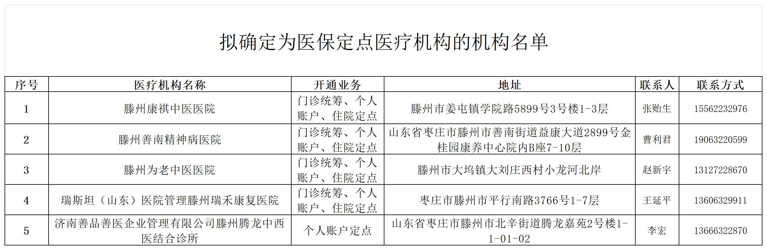 根据《医疗机构医疗保障定点管理暂行办法》(国家医疗保障局令第2号)、《关于印发<枣庄市医疗保障定点医药服务资源配置规划(2025-2027年)>的通知》(枣医保发〔2025〕2号)以及《关于进一步调整完善我市定点医药机构准入评估有关事项的通知》(枣医保中心发〔2025〕1 号)相关要求,滕州市医保部门组织评估小组对申请医保定点的医疗机构开展了评估。现对拟确定为定点医疗机构的单位予以公示(机构信息见附件)。公示期限为5个工作日。公示无异议的,由属地医保经办机构与其签订医疗服务协议后,统一向社会公布。