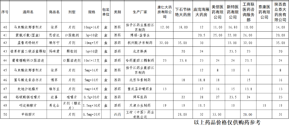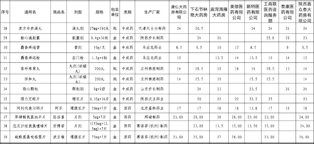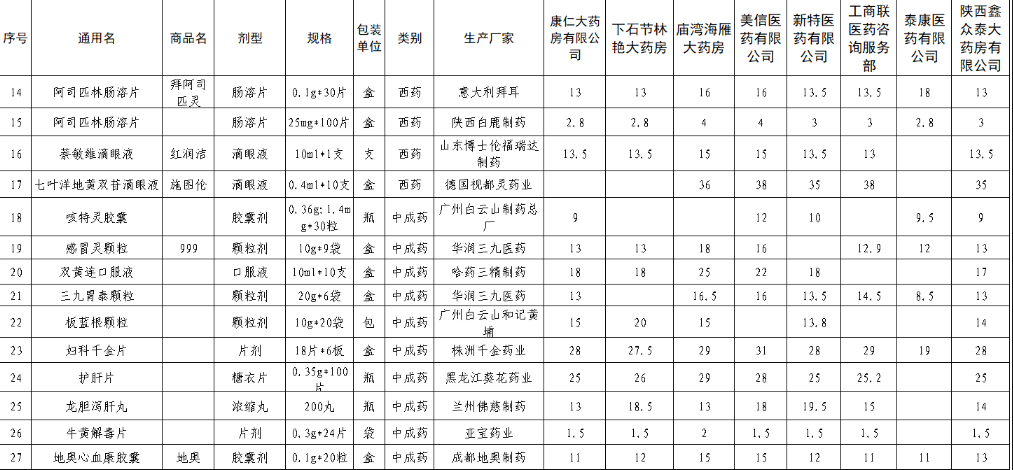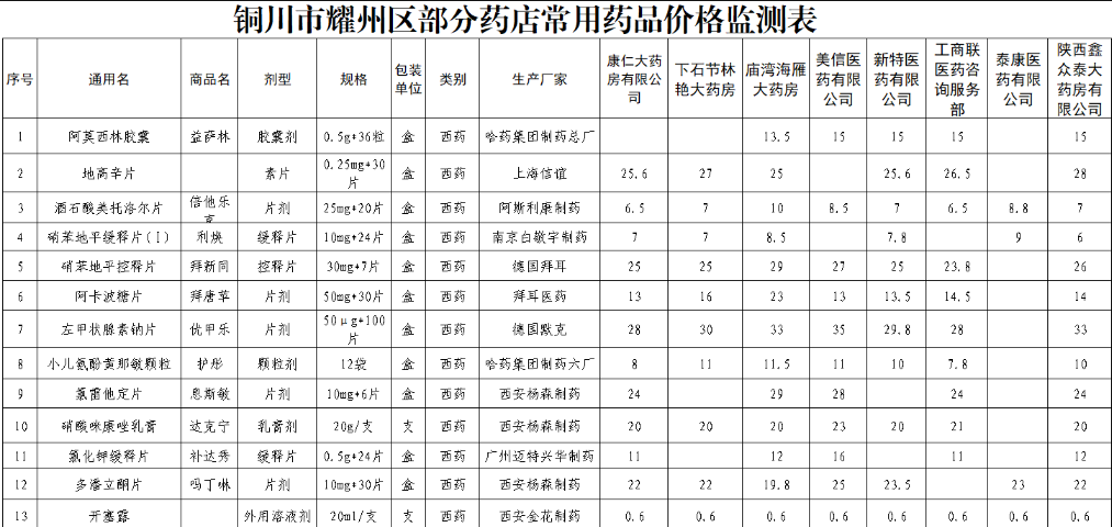 【铜川】5月份铜川市耀州区部分药店常用药品价格监测表
