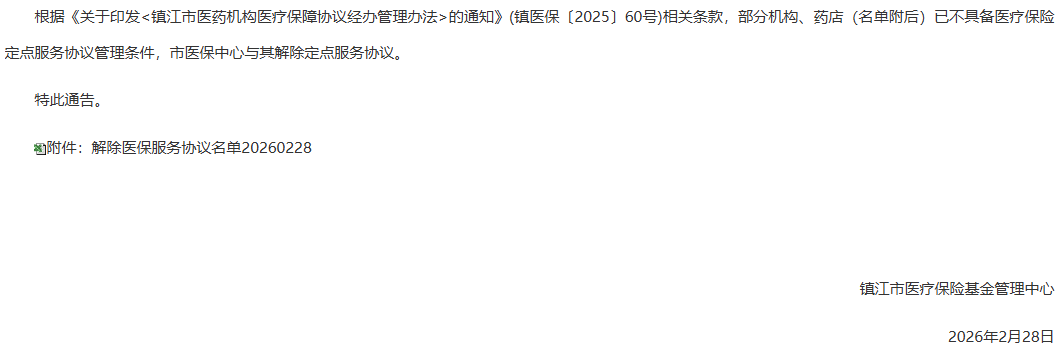 【镇江】关于解除医保服务协议的通告