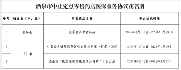 依据《零售药店医疗保障定点管理暂行办法》(国家医疗保障局令第3号)等规定及《酒泉市基本保险定点零售药店医保服务协议》约定,现中止金塔县济世堂药店等3家定点零售药店医保服务协议,特此公告。