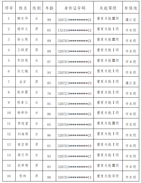 根据《市政府关于建立长期护理保险制度的意见》(连政发〔2023〕26号)、《连云港市职工长期护理保险实施细则(试行)》(连医保〔2023〕44号)文件精神,按照国家医保局《长期护理失能等级评估标准(试行)》(医保办发〔2021〕37号),经评估机构评估,现将本次连云港市长期护理保险失能等级评估的结论公示如下: