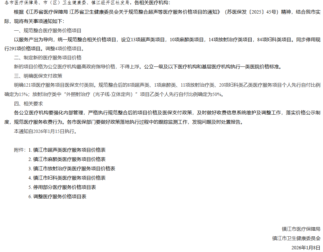 【镇江】镇江市医疗保障局镇江市卫生健康委员会关于规范整合超声等医疗服务价格项目的通知