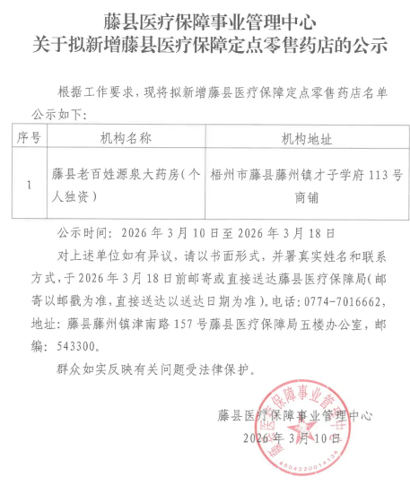 【梧州】关于拟新增藤县医疗保障定点零售药店的公示
