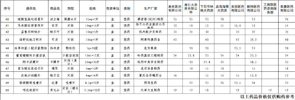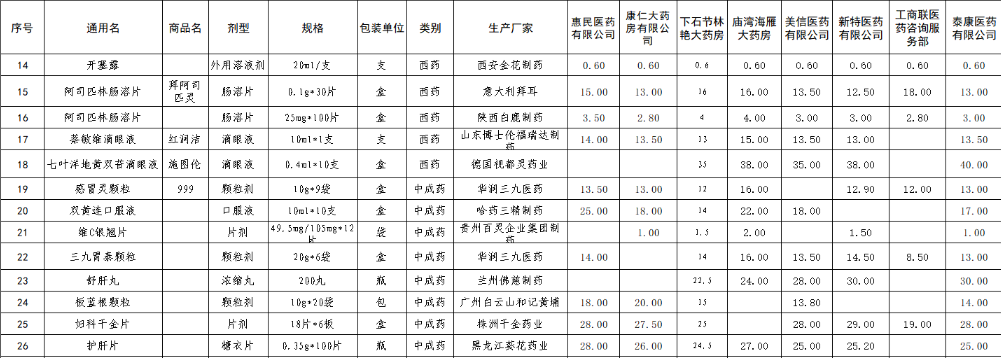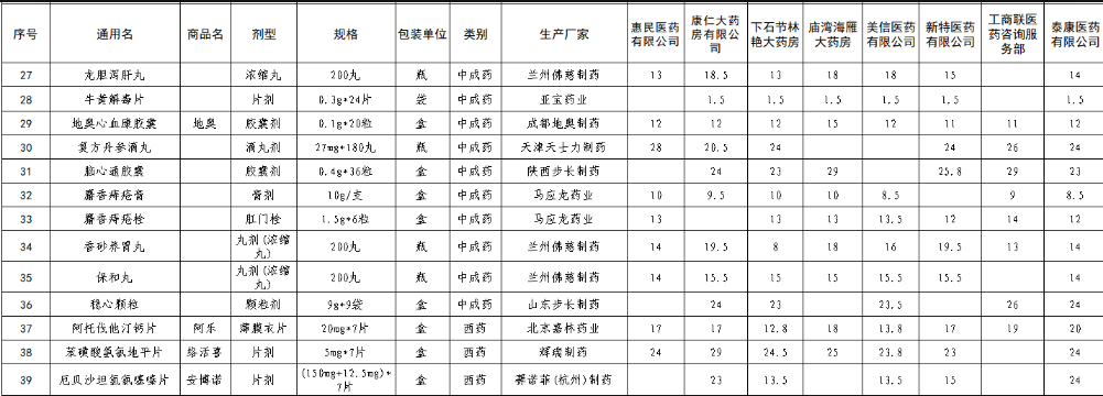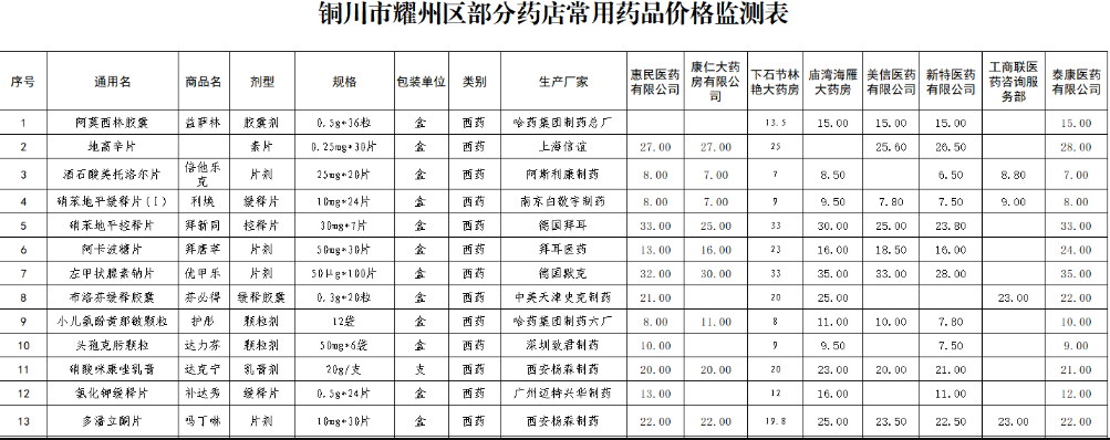 【铜川】1月份铜川市耀州区部分药店常用药品价格监测表