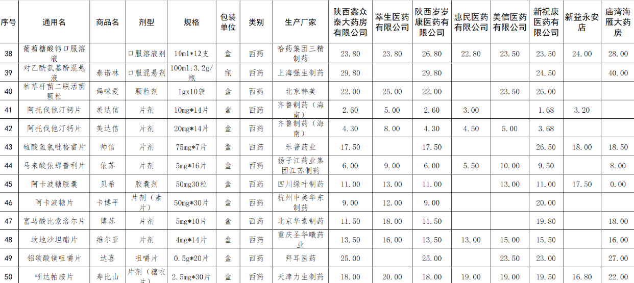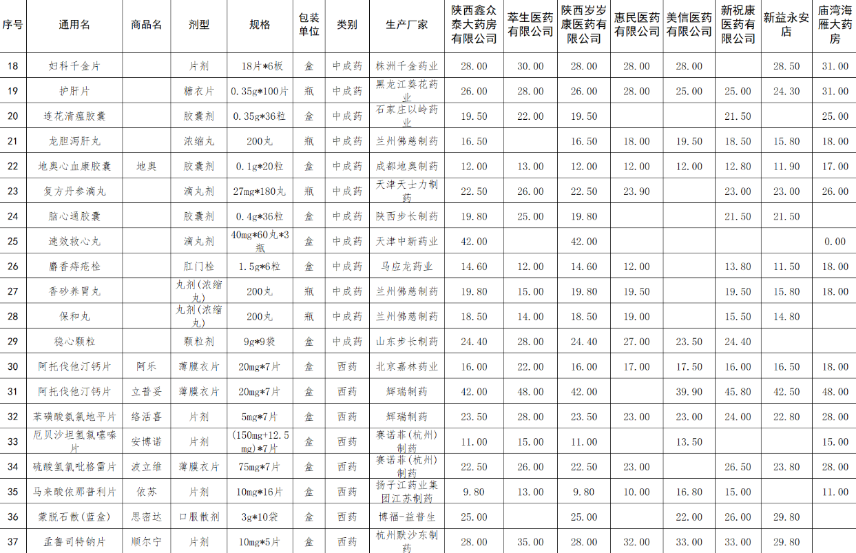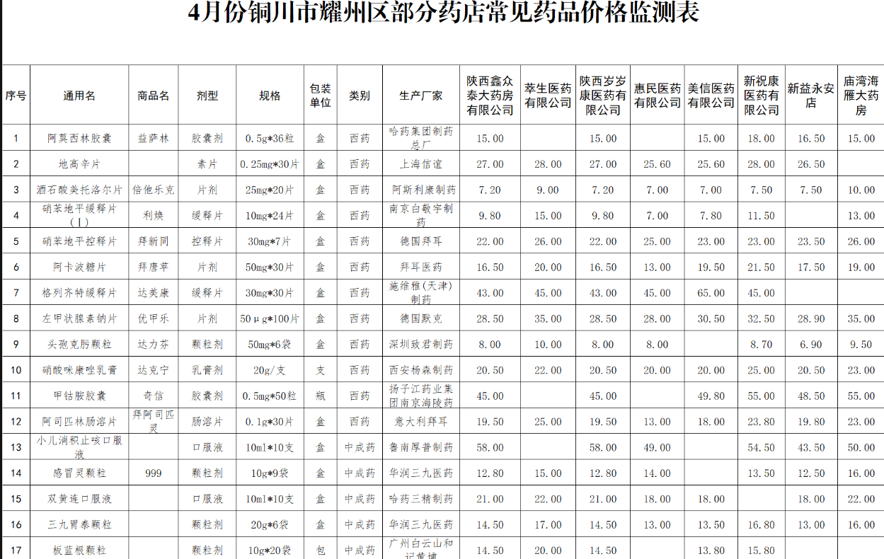 【铜川】4月份铜川市耀州区部分药店常见药品价格监测表