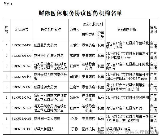 【邢台】威县医疗保险事业管理中心关于解除部分定点医药机构医保服务协议的公告