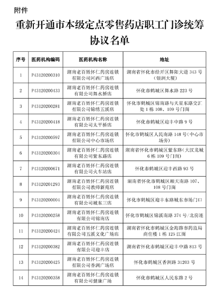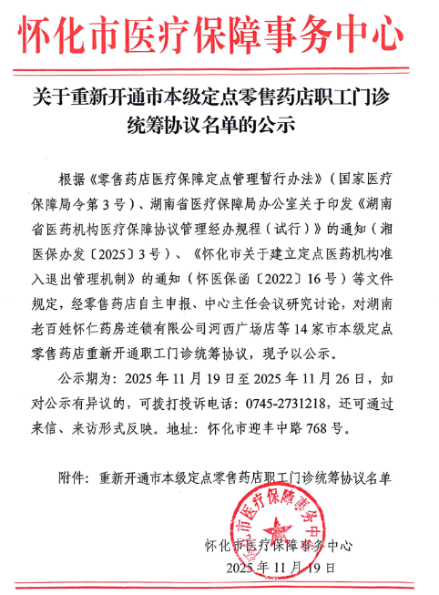 【怀化】关于重新开通市本级定点零售药店职工门诊统筹协议名单的公示