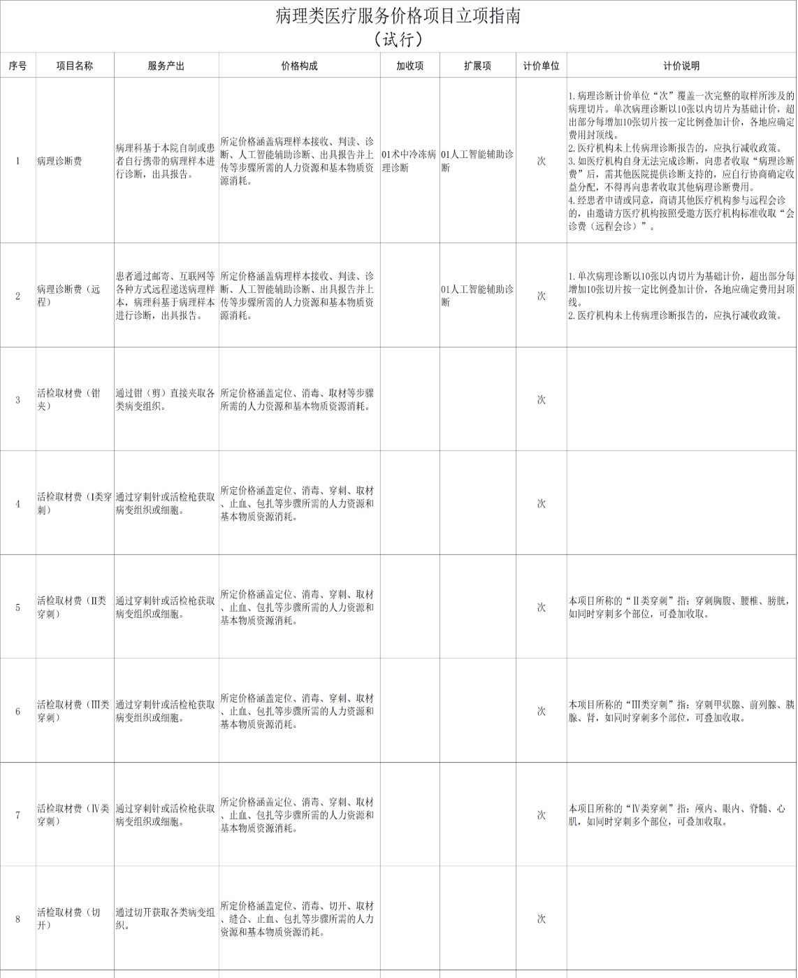 为贯彻落实《深化医疗服务价格改革试点方案》,推进全国医疗服务价格项目规范编制工作,按照“成熟一批、发布一批”的工作思路,国家医保局编制印发了《病理类医疗服务价格项目立项指南(试行)》,将已有价格项目规范整合为28项、加收项3项、扩展项2项。