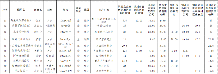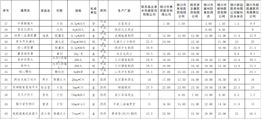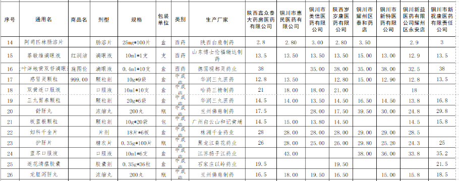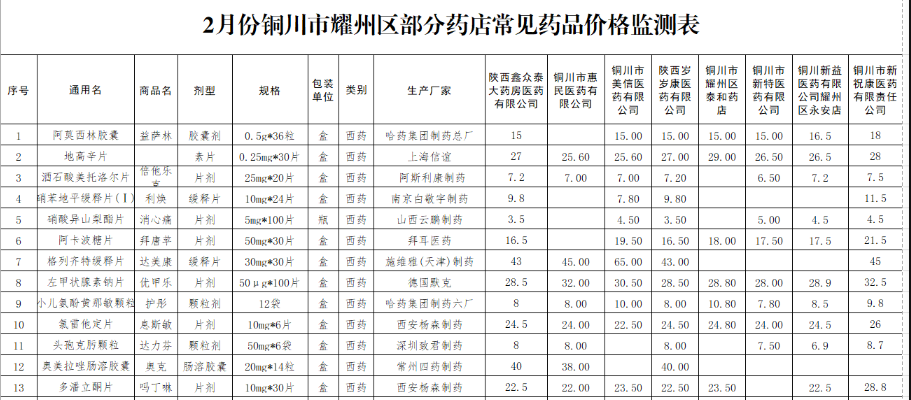 【铜川】2月份铜川市耀州区部分药店常见药品价格监测表