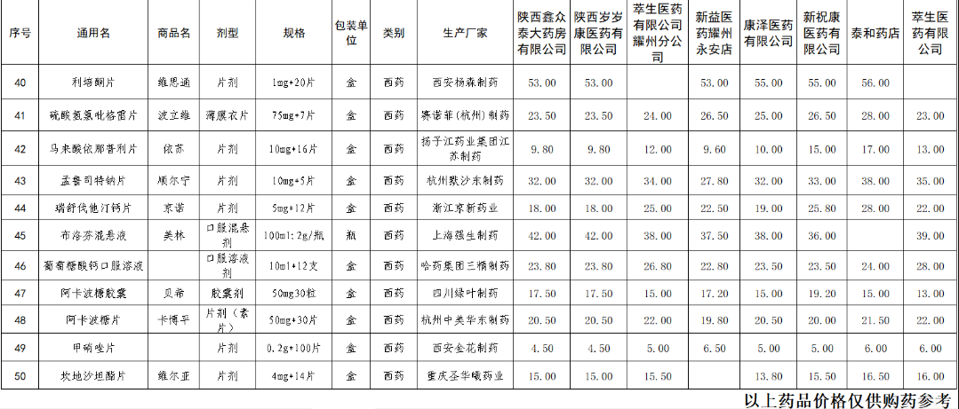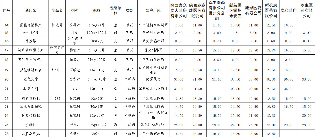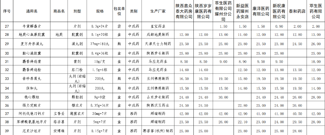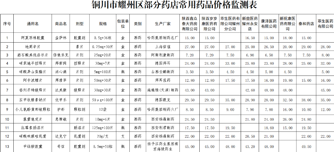 【铜川】2月份铜川市耀州区部分药店常用药品价格监测表