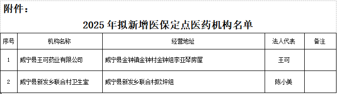 根据《医疗机构医疗保障定点管理暂行办法》(国家医疗保障局令第2号)《零售药店医疗保障定点管理暂行办法》(国家医疗保障局令第3号)《省医疗保障事务中心关于印发<贵州省医疗保障定点零售药店协议管理经办规程(试行)>的通知》(黔医保事务中心发〔2021〕26号)《省医疗保障事务中心关于印发<贵州省医疗保障定点医疗机构协议管理经办规程(试行)>的通知》(黔医保事务中心发〔2021〕27号)等相关文件规定,经医保局2025年12月13日党组会议研究,同意将威宁县王可药业有限公司、威宁县新发乡联合村卫生室2家医药机构(详见附件)纳入毕节市基本医疗保险定点医药机构,现予以公示。